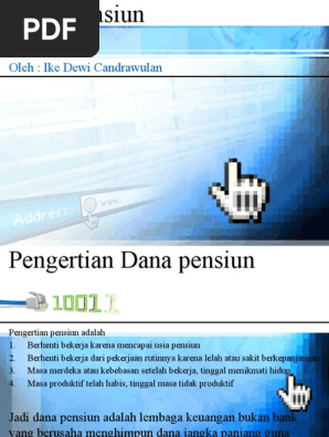 Bagi pemberi kerja tujuan atau manfaat penyelenggaraan dana pensiun bagai karyawan adalah sebagai berikut: Memberikan penghargaan kepada para karyawan yang telah mengabdi diperusahaan tersebut. Agar dimasa usia pensiun karyawan tersebut tetap dapat menikmati hasil yang diperoleh setelah bekerja diperusahaannya. Dana Pensiun Pemberi Kerja, adalah dana pensiun yang dibentuk oleh orang atau badan yang mempekerjakan karyawan, selaku pendiri, untuk menyelenggarakan program pensiun Manfaat Pasti atau program pensiun Iuran Pasti, bagi kepentingan sebagian atau seluruh karyawannya sebagai peserta, dan menimbulkan kewajiban terhadap pemberi kerja.; Dana Pensiun Lembaga Keuangan, adalah dana pensiun yang ... Dana Pensiun Lembaga Keuangan. Jenis ini merupakan dana pensiun pemberi kerja dengan iuran pasti dan hanya diberikan pemberi kerja berdasarkan rumus terkait keuntungan pemberi kerja. Nah, untuk Dana Pensiun Lembaga Keuangan ini, kemarin sudah kita bahas dalam satu artikel khusus. Silakan dibaca ya, untuk detailnya. Berdasarkan Peraturan Dana Pensiun ditetapkan sebagai berikut: Iuran Normal Pemberi Kerja : 8% PhDP. Iuran Normal Peserta : 2% PhDP. Transaksi yang terjadi selama tahun 2002 adalah sebagai berikut : Iuran normal diterima adalah sebesar Rp 90 jt, masing-masing Rp 70 jt dari pemberi kerja dan sisanya berasal dari peserta.