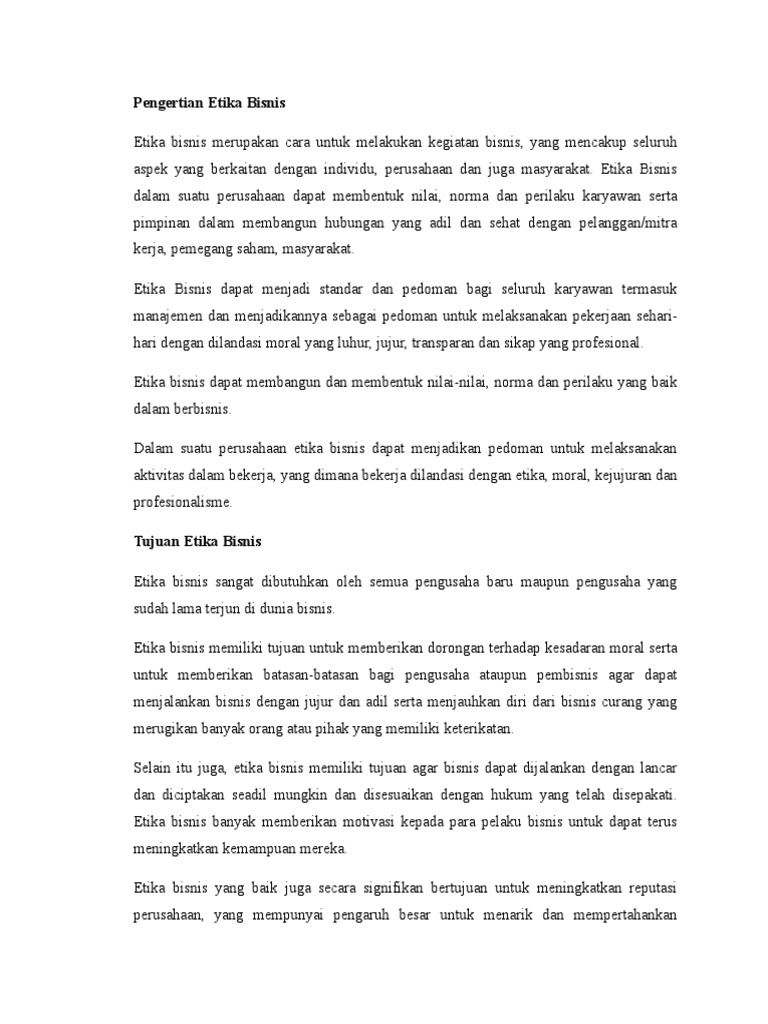 Etika bisnis dalam perusahaan. Pentingnya Etika Bisnis dalam Perusahaan Etika bisnis merupakan suatu studi mengenai prinsip-prinsip atau standar-standar moral dan bagaimana standar-standar ini berlaku bagi sistem dan organisasi yang digunakan oleh masyarakat untuk menghasilkan dan mendistribusikan barang dan jasa, dan bagi orang-orang yang bekerja di dalam organisasi tersebut. Etika bisnis merupakan suatu fondasi yang harus dimiliki bagi seluruh perusahaan manapun tanpa terkecuali sebab nantinya etika dalam bisnis akan berpengaruh terhadap berjalannya suatu usaha. Muslich (2004: 9) mengatakan bahwa etika bisnis merupakan suatu ilmu pengetahuan yang mempelajari mengenai tata cara yang seharusnya diberlakukan dalam ... Dalam perusahaan etika bisnis guna untuk membentuk peraturan atau norma dan perilaku karyawan dalam menjalin hubungan yang baik dengan perusahaan, atasan, rekan kerja, ataupun pemegang saham dan pihak luar lainnya. Etika bisnis juga salah satu unsur untuk melihat apakah perusahaan itu maju atau mundur dalam menjalankan bisnisnya. Etika bisnis adalah aturan yang tidak tertulis tentang benar dan tidaknya dalam menjalankan suatu bisnis yang mencakup segala aspek kegiatan bisnis baik itu individu, perusahaan dan masyarakat.