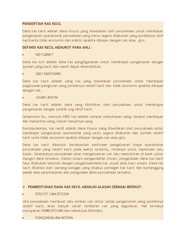 Pengertian dan Ruang Lingkup Kas Kecil Kas Kecil merupakan uang kas yang disediakan untuk membayar pengeluaran yang jumlahnya kecil dan tidak bisa dilakukan melalui check atau giro. Bentuk dari Kas Kecil ini adalah uang tunai dengan jumlah yang tetap atau berubah tergantung metode yang digunakan.