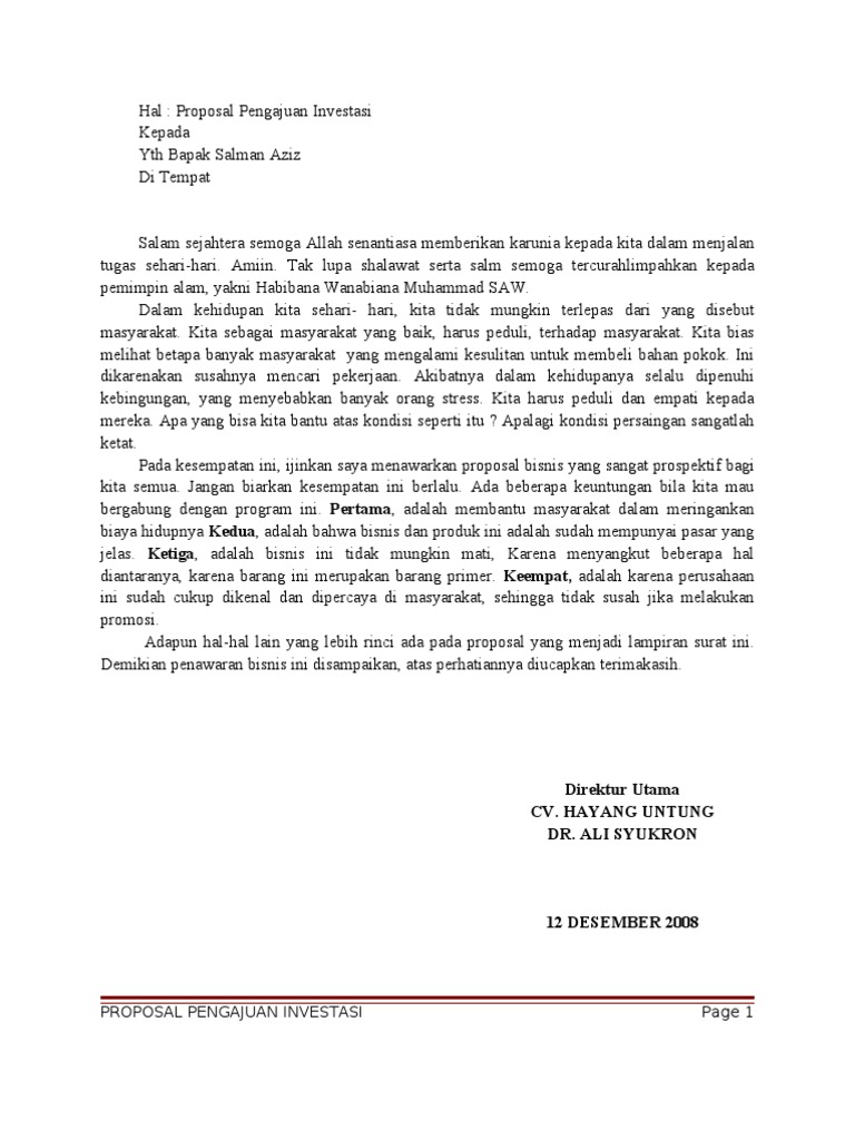 Contoh proposal pinjaman dana ke investor. Contoh Proposal Pengajuan Pinjaman Modal Usaha Ke Bank | PDF Download now. SaveSave Contoh Proposal Pengajuan Pinjaman Modal Usaha Ke ... Download as PDF, TXT or read online from Scribd. Flag for inappropriate content. SaveSave Contoh Proposal Pengajuan Pinjaman Modal Usaha Ke ... 4 Contoh Proposal Pengajuan Dana Secara Baik dan Benar. Lengkap! Contoh proposal pengajuan dana yang baik dan benar diperlukan bagi kamu yang masih merasa kesulitan dalam membuatnya. Dengan begitu, calon donatur berpeluang besar memberikan sumbangan untuk kegiatan yang kamu buat. Sahabat 99, pengajuan bantuan dana bisa gagal jika kamu tidak... Contoh Proposal Pengajuan Dana » RepublikSEO Contoh Proposal Pengajuan Dana ke PT Mega Food Nasional. I. PENDAHULUAN. Sebagai salah satu tempat yang banyak dikunjungi orang di Tangerang, AEON Mall kerap dijadikan tempat untuk usaha dan juga menikmati berbagai fasilitas didalamnya, terutama usaha kuliner yang diposisikan di... Jasa Proposal Usaha Untuk Investor Pinjaman Investasi Modal Bisnis ...maka bisa diharapkan proposal pinjaman dana ke investor bisa langsung direalisasikan. Contoh saja beberapa pemesan sangat masih belum memikirkan dari sisi laporan keuangan perusahaan. Untuk merancang jenis proposal ini, kami selaku jasa proposal usaha ke investor tentunya...