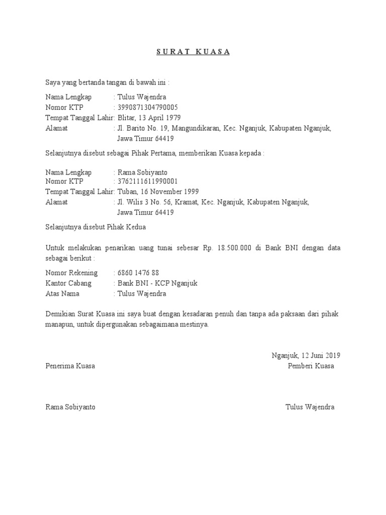bergaya.id › contoh-surat-kuasa-bank7 Contoh Surat Kuasa Bank, Semua Bank (Terbaru 2022) Dec 22, 2021 · 2. Contoh Surat Kuasa Bank BNI. SURAT KUASA PENARIKAN UANG BANK BNI. Saya yang bertanda tangan di bawah ini, Nama : Ramadhani Ayla. NIK : 61701918271. Alamat : Jalan Kalimantan No. 8, Surabaya, Jawa Timur. Selanjutnya disebut Pihak Pertama.