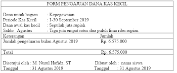 (PDF) Dokumen Pengajuan Uang Tunai/Kas Kecil | M Reyhan ... Formulir pengajuan dana kas kecil berisikan : i. Dana untuk bagian : diisi pengajuan uang untuk unit kerja tertentu ii. Periode kas kecil : diisi untuk periode tanggal bulan tahun tertentu iii. Dana awal kas kecil : diisi sejumlah uang tunai yang telah ditentukan iv. ...