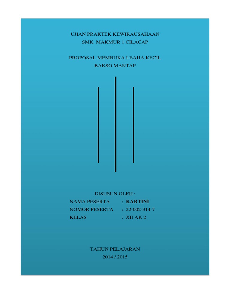 12 Contoh Desain Cover Proposal Paling Menarik ... 12 Contoh Desain Cover Proposal yang Terlihat Menarik dan Meyakinkan Anda punya usaha atau keahlian yang ingin ditawarkan kepada target market? Biasanya akan ada waktu dimana Anda perlu membuat sebuah proposal yang mampu meyakinkan si penerima proposal tersebut. 20 Contoh Cover Makalah & Proposal Menarik Serta Cara ... Contoh Cover Proposal Kegiatan Cover proposal kegiatan sangatlah penting. Karna cover adalah bagian pertama yang dilihat oleh calon donatur atau calon sponsorship. Darinya akan timbul kesan dan stigma, apakah proposal kamu layak diterima atau tidak. Nah, sebaik-baik cover proposal kegiatan adalah yang matching dengan bentuk dan nuansa kegiatannya. Contoh Proposal Usaha dan Bisnis untuk Pengajuan Kerja Sama Contoh Proposal Usaha dan Bisnis. Setelah mengetahui kerangka pada proposal usaha dan bisnis, sekarang saatnya kamu mempelajari langsung melalui contoh. Di bawah ini terdapat dua contoh proposal usaha dan bisnis di bidang perdagangan dan jasa. Aspek-aspek yang ada di dalam proposal bisa disesuaikan dengan jenis usahanya, ya. Contoh Proposal Usaha Bisnis Plan Lengkap 2022 Contoh Proposal Usaha Bisnis Plan Lengkap 2022. Contoh proposal usaha tentunya dapat memberikan gambaran perencanaan sebelum memulai sebuah bisnis, sekaligus dapat meyakinkan calon investor. Melalui contoh proposal usaha, pelaku bisnis dapat mempersiapkan modal hingga melihat peluang pasar yang dapat diterapkan pada bisnisnya.