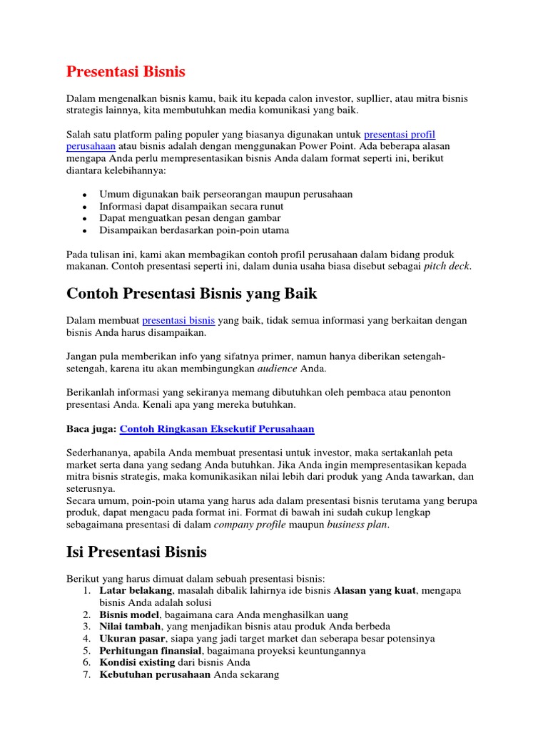 Contoh Presentasi Bisnis / Pitch Deck / Presentasi Rencana ... Download Presentasi Bisnis Makanan. Untuk lebih jelas, silakan Anda simak contoh presentasi bisnis dari produk makanan dari perusahaan Teri Mayai ini. Anda dapat mendownload dokumen berikut setelah membagikan artikel ini lewat media sosial favorit kamu. Jika ada pertanyaan, silakan disampaikan lewat kolom komentar. ...