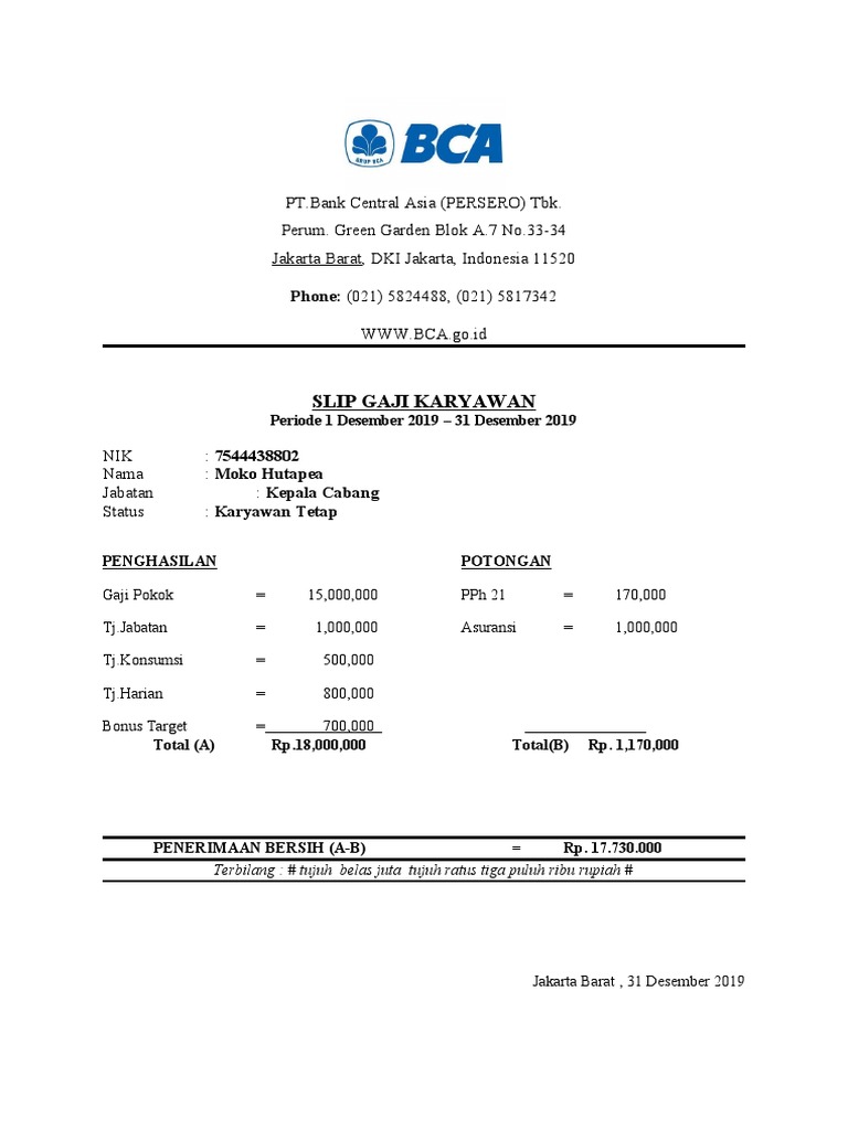 Gaji kepala cabang bank. Gaji Pegawai Bank BCA Tahun 2022 Terbaru Semua Jabatan 8. Kepala Cabang. Pada bank cabang, jabatan paling tinggi digenggam oleh kepala cabang. Tugasnya sudah tentu memimpin seluruh pekerjaan yang ada dan memastikannya lancar. Tugas paling besar digenggam oleh kepala kantor cabang, jadi jangan heran kalau gaji pegawai bank BCA sisi kepala cabang yang paling besar. Gaji Pegawai Bank BCA Semua Jabatan Tahun 2020 - Karyawan ... Hal ini dikarenakan berbagai faktor, salah satunya gaji Pegawai bank BCA yang sangat menggiurkan. Daftar Isi Tutup 1. Gaji Pegawai Bank BCA 2. Profil Perusahaan 3. Layanan Bank BCA 3.1. 1. Investasi dan Asuransi 3.2. 2. Pinjaman 3.3. 3. Kartu debit dan kredit 4. Kesimpulan Gaji Pegawai Bank BCA Profil Perusahaan Ini Besaran Gaji untuk Karyawan Bank dan Asuransi di ... Berikut panduan gaji bidang perbankan dan keuangan dengan menyertakan posisi pekerjaan yang banyak diminati, kualifikasi minimum, masa pengalaman kerja, serta rentang gaji per bulan, dari batas minimum hingga maksimum: Asuransi. 1. Chief Information Security Officer (pendidikan S1, masa kerja di atas 10 tahun, rentang gaji Rp 60 juta-Rp 80 juta ... 100+ Gaji Pegawai Bank BRI Lengkap dan Tes Rekrutment ... Gaji Magang Bank BRI = 1,5 Jt sampai 1,7 Jt/ Bulan. Sales Support Center = 2 Jt sampai 3 Jt/ Bulan. Bahkan untuk posisi dimana fresh graduate baru masuk untuk bekerja pendapatan dan gajinya adalah sekitar Rp 3.800.000 sampai dengan Rp 4.000.000. Yang mana gaji tersebut terbilang cukup besar dibanding bank lainnya.