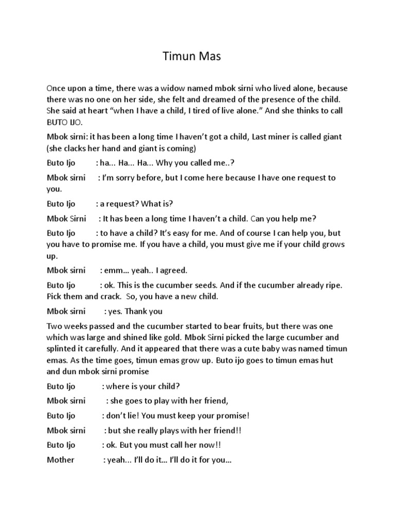 NASKAH DRAMA TIMUN MAS (ENGLISH) | Zoombarta NASKAH DRAMA TIMUN MAS (ENGLISH) Act 1. Narrator : Once upon a time, in a place deep inside the forest, there were a green giant named Buto Ijo and a sacred hermit. They were best friends since toddlers. One day, the hermit came to the grotto to see his best friend.