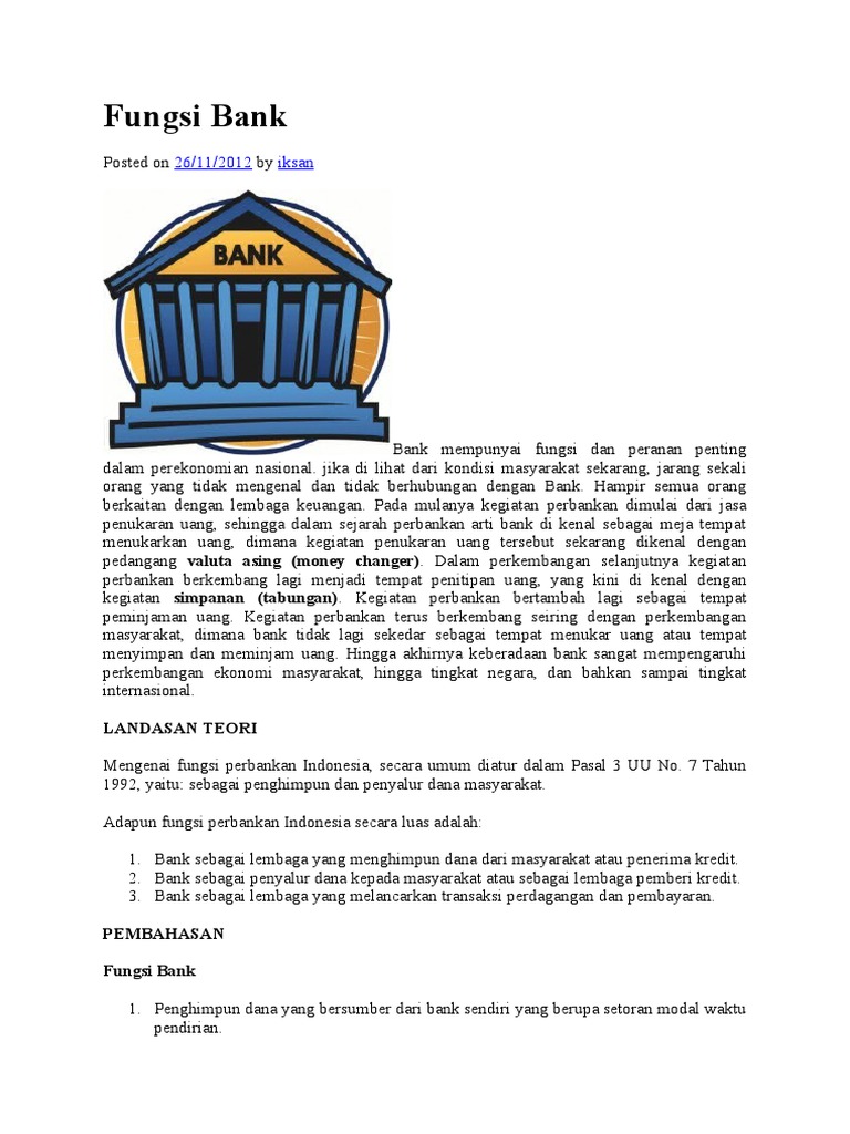 Pengertian Bank dan Fungsi Bank Secara Umum - Berita ... Fungsi Bank Secara Umum Fungsi Bank. Berikut ini beberapa fungsi dari adanya bank: 1. Menghimpun Dana Dari Masyarakat. Bank menghimpun dana dari masyarakat melalui tabungan, deposito berjangka, giro ataupun bentuk simpanan lainnya. Dengan penghimpunan dana ini, bank menjamin keamanan uang masyarakat tersebut sekaligus memberikan bunga yang ...